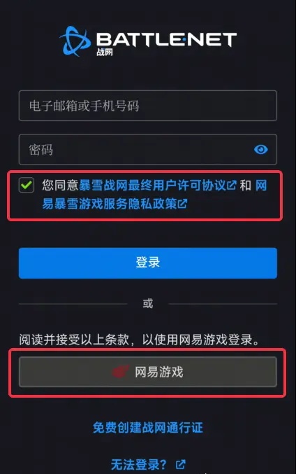 1.打開(kāi)戰(zhàn)網(wǎng)客戶端時(shí)打開(kāi)戰(zhàn)網(wǎng)網(wǎng)頁(yè),閱讀并勾選同意條款,點(diǎn)擊 網(wǎng)易游戲 按鈕。