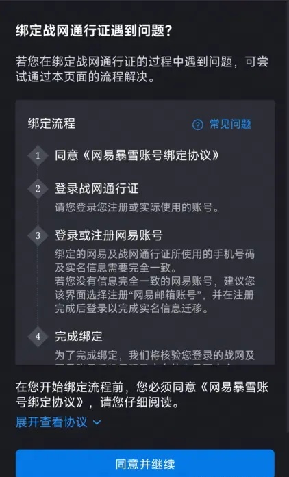 2.登錄網(wǎng)易賬號(hào),請(qǐng)注意:新注冊(cè)網(wǎng)易賬號(hào)的綁定手機(jī)號(hào)碼需要與待綁定戰(zhàn)網(wǎng)通行證手機(jī)號(hào)碼相同,新注冊(cè)網(wǎng)易賬號(hào)與待綁定戰(zhàn)網(wǎng)通行證的實(shí)名信息需相同,閱讀綁定協(xié)議同意并繼續(xù)。