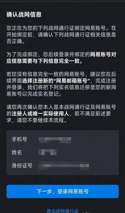 5.確認(rèn)需要綁定的戰(zhàn)網(wǎng)通行證信息,點(diǎn)擊下一步,登錄網(wǎng)易賬號(hào)