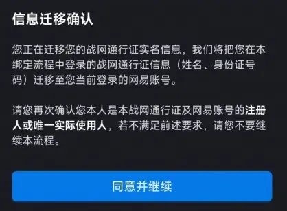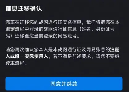 3.開(kāi)始實(shí)名信息遷移,閱讀綁定流程及賬號(hào)綁定協(xié)議,點(diǎn)擊同意并繼續(xù)