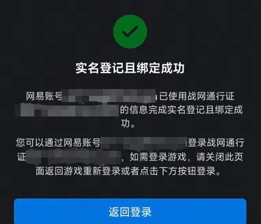 8.網(wǎng)易賬號(hào)已使用戰(zhàn)網(wǎng)通行證的信息完成實(shí)名登記且綁定成功,點(diǎn)擊返回登錄回到戰(zhàn)網(wǎng)通行證登錄頁(yè)面,使用網(wǎng)易賬號(hào)登錄即可。