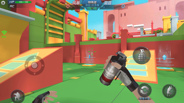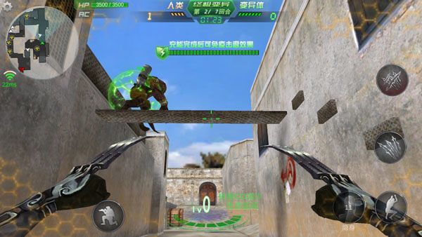 游戲畫面左下角有一個(gè)圓圈狀的虛擬按鈕,右下角有個(gè)未顯示的虛擬按鈕,玩家通過滑動(dòng)虛擬按鈕控制人物的動(dòng)作。其中左下角的虛擬按鈕控制移動(dòng)右下角的虛擬按 鈕控制準(zhǔn)星和射擊。同時(shí),在畫面左上角設(shè)置按鈕中有戰(zhàn)績查詢、游戲設(shè)置、鍵位設(shè)置功能,左下角有蹲下按鈕,畫面右側(cè)分布有跳躍、切換武器、換子彈、扔手雷 等按鈕。