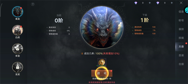 將天獸進(jìn)化,提升真實免傷、怪物減傷等屬性,增強(qiáng)生存能力,但需注意需要再進(jìn)化幾率100%在進(jìn)化【本系統(tǒng)深度較淺:20階滿級畢業(yè)】。