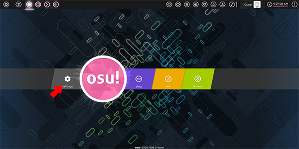 1、在本站下載安裝并打開osu完成首次打開的基礎(chǔ)設(shè)置之后即可來到游戲首頁,點擊OSU!按鈕左側(cè)的Settings選項