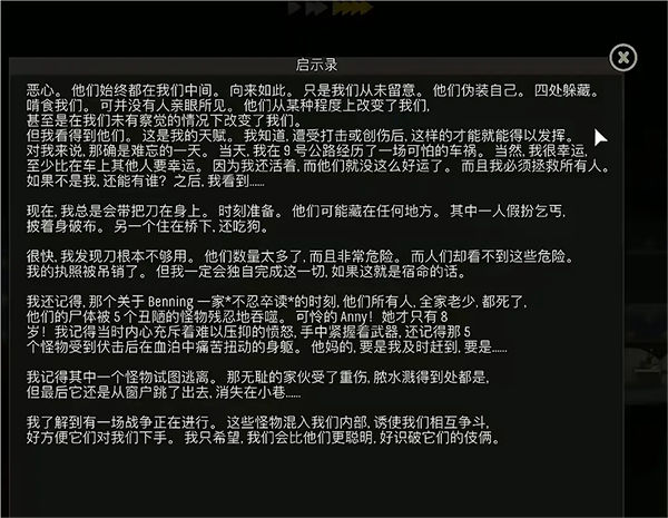 結(jié)局一:世界觀,首次進(jìn)入游戲會播放一段動(dòng)畫,大意是歐美和東方(個(gè)人感覺就是亞洲)進(jìn)行戰(zhàn)爭,但是東方投下了生化武器,大家都變異了,而外出的主角為了活著出去見到女兒必須從一百樓殺出去。