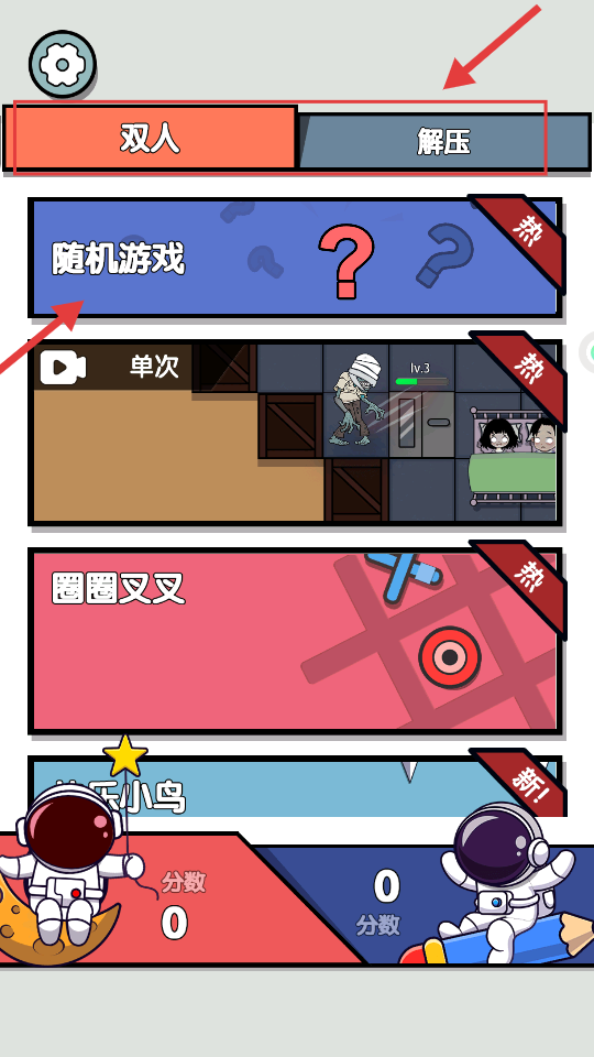 1、在游戲選擇頁,選【雙人】或【解壓】標(biāo)簽下模式(如隨機(jī)游戲),進(jìn)入玩法。