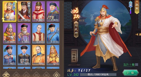 軍事升級主要是對關(guān)卡的貢獻(xiàn)。在此建議前期要偏向于商業(yè)大臣和軍事大臣,因?yàn)樯虡I(yè)提高后,征收會獲得更對的銀兩,而軍事提高后,有利于關(guān)卡戰(zhàn)斗力會相應(yīng)提高。在游戲前期盡快進(jìn)行關(guān)卡戰(zhàn)斗獲取君王經(jīng)驗(yàn),君王等級每提升一級會開啟一次科舉選取,圣上們可以選擇自己喜愛的大臣冊封狀元,大臣升級是提升國力的最快最基本的方式。