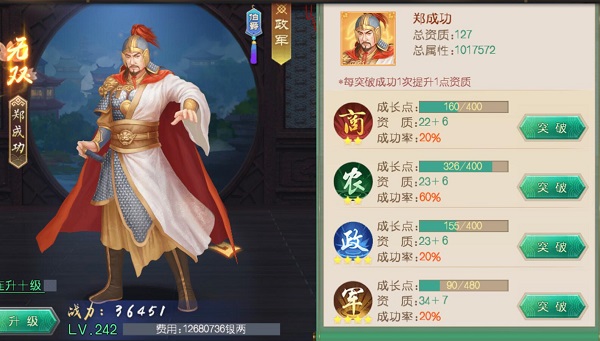 每個(gè)大臣的屬性是不一樣的,有些玩家會選擇先升級商業(yè)屬性的,有些玩家會選擇先升級軍事屬性的,這個(gè)和每個(gè)人的玩法有區(qū)別。