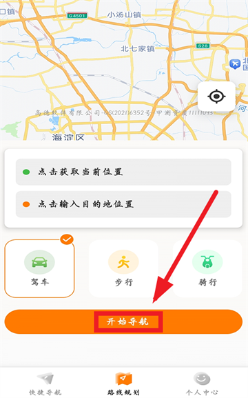 打開實(shí)時(shí)路況衛(wèi)星導(dǎo)航app,進(jìn)入后在路線規(guī)劃界面選擇當(dāng)前位置和目的地,選擇出行方式,點(diǎn)擊開始導(dǎo)航