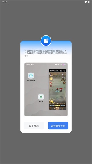 1、首次進(jìn)入葫蘆俠虛擬機(jī)App需要在設(shè)置中開啟懸浮窗權(quán)限;