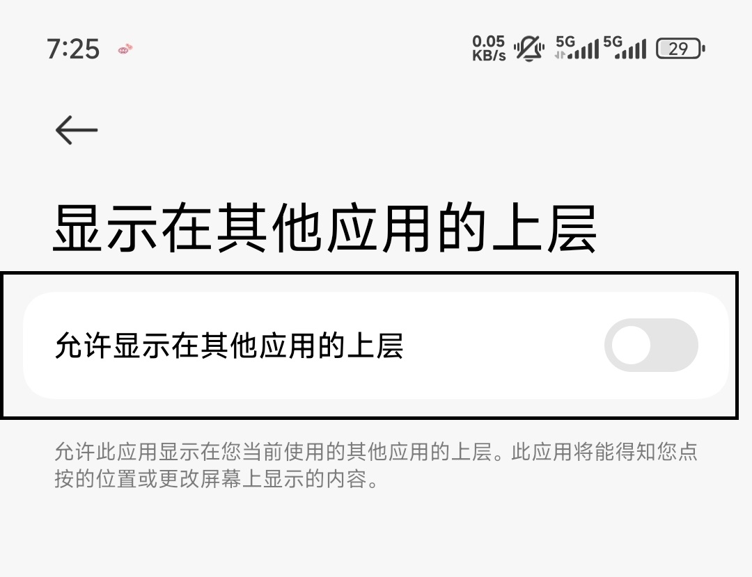2、點(diǎn)擊開啟權(quán)限允許顯示在其他應(yīng)用的上層;
