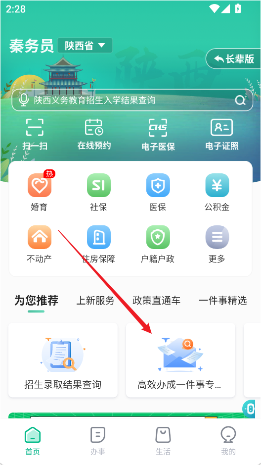1、打開秦務(wù)員App,進(jìn)入首頁并點(diǎn)擊「高效辦成一件事專區(qū)」,選擇「教育入學(xué)一件事」。