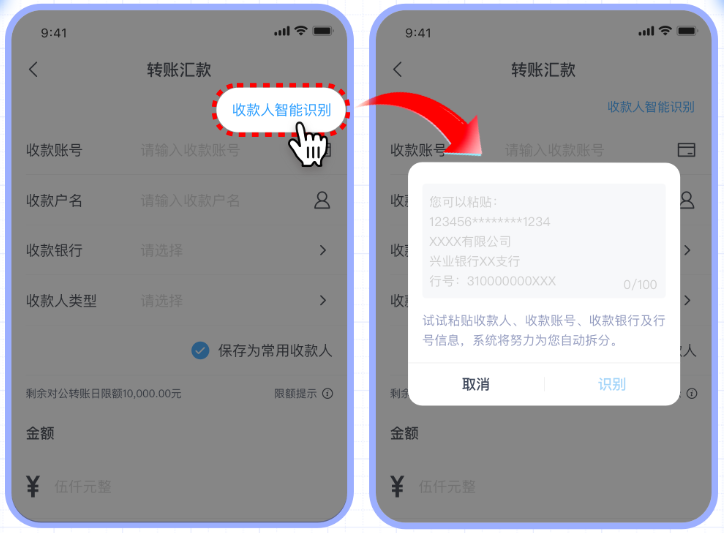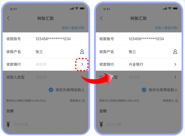 當(dāng)您輸入收款人賬號(hào)與戶名后,智能補(bǔ)錄功能會(huì)自動(dòng)檢索匹配收款銀行信息,如果匹配成功則自動(dòng)回填收款銀行,無(wú)需您手動(dòng)查找和輸入,讓您的轉(zhuǎn)賬過(guò)程更高效!