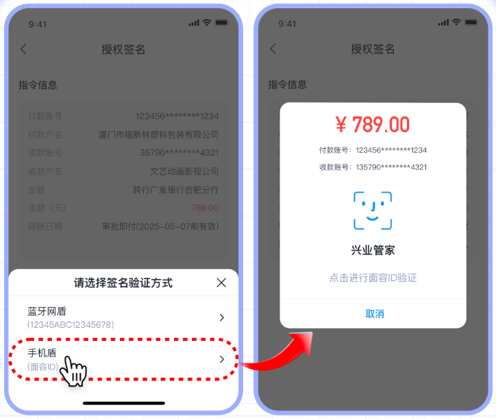 手機(jī)盾功能,將生物認(rèn)證與數(shù)字簽名相結(jié)合。當(dāng)您進(jìn)行轉(zhuǎn)賬操作時(shí),無(wú)需再攜帶藍(lán)牙盾,只需使用指紋或人臉認(rèn)證,即可快速完成簽名,讓轉(zhuǎn)賬瞬間完成。安全與便捷并存,讓您的資金管理更加輕松自如!