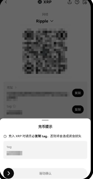 打開歐易App,點擊【資產(chǎn)】—【充幣】—【充入數(shù)字貨幣】; 搜索或者直接點擊要充幣的數(shù)字資產(chǎn)(以XRP為例),選擇充幣網(wǎng)絡; 您選擇的幣種網(wǎng)絡若需要填寫標簽(又名Tag/Memo,通常是一串數(shù)字),系統(tǒng)會有提醒,【滑動確認】后即可查看并復制該幣種的【充幣地址】與【標簽】。