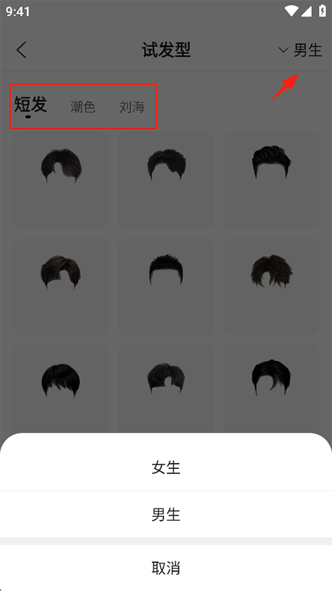2、在右上角點(diǎn)擊切換男生/女生性別,下方選擇發(fā)型類(lèi)別;