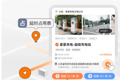 2、查看卡片或場(chǎng)站詳情,“導(dǎo)航”按鈕助您到達(dá)場(chǎng)站;注意部分場(chǎng)站超時(shí)占用費(fèi)。